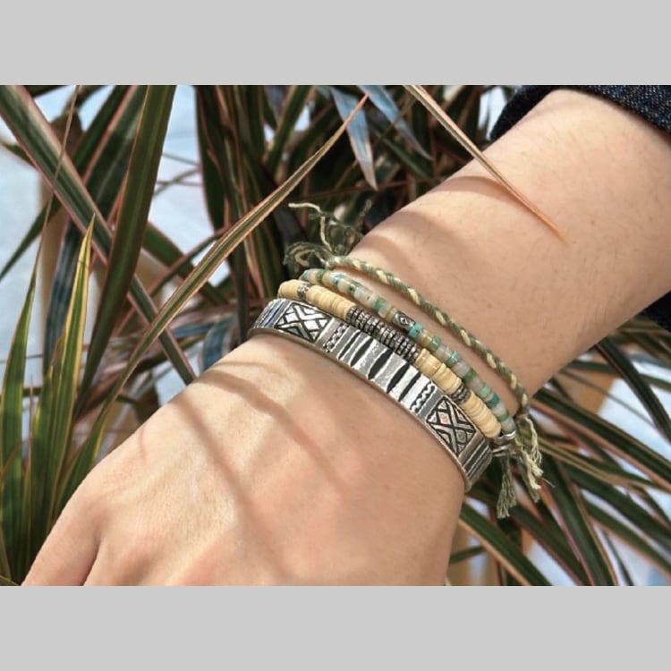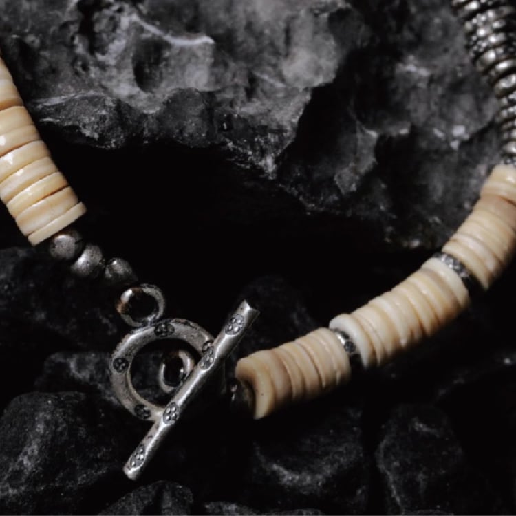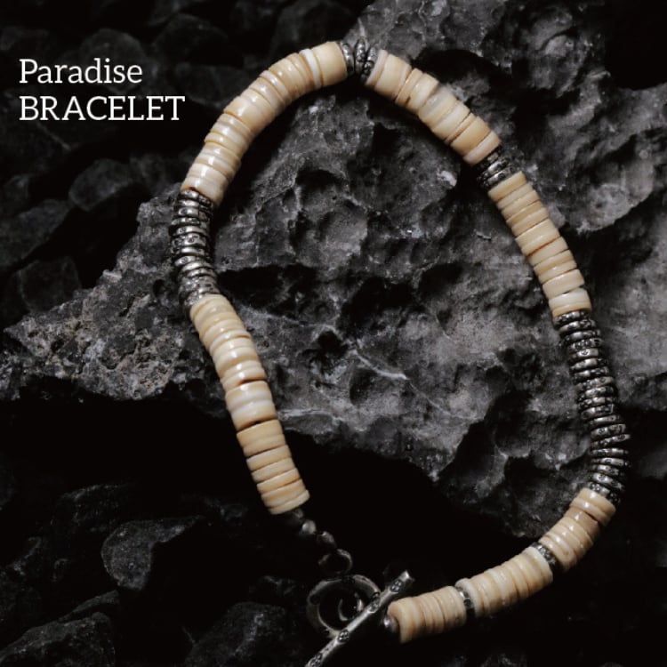 上品なシェルと、存在感のあるメタルビーズを組み合わせたブレスレット。