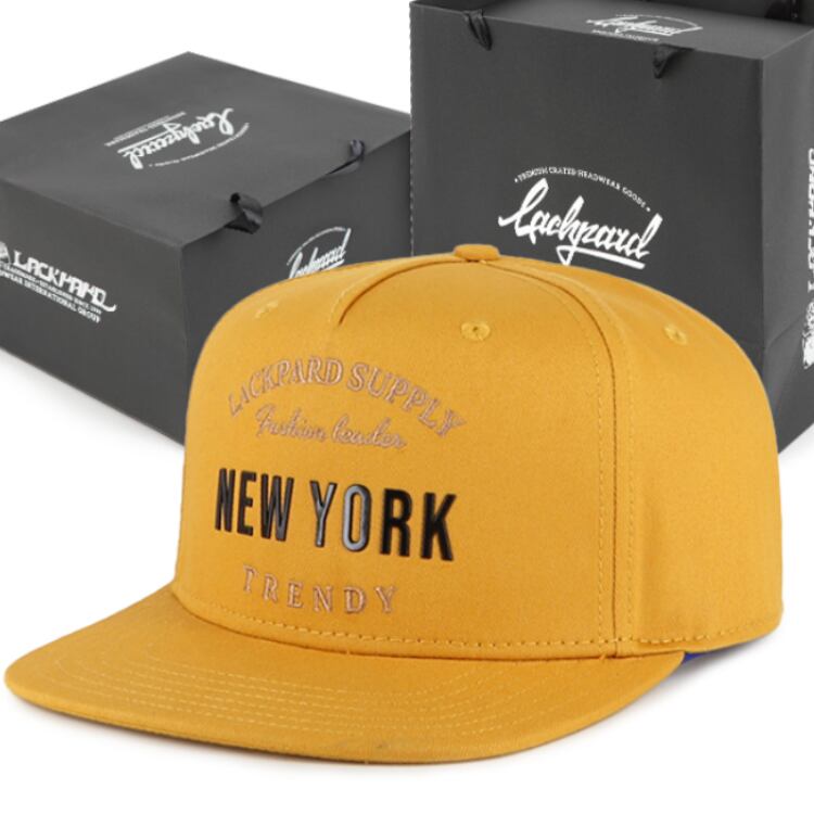 「NEW YORK」の刺繍ロゴが目を引く、フラットバイザーのスナップバックキャップ。