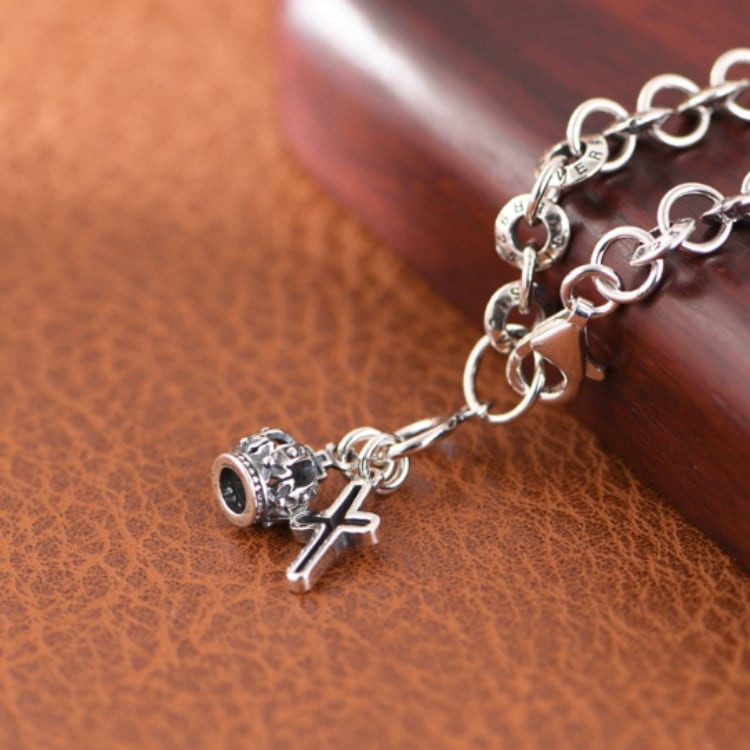 チェーンの重厚感と、オーバルチャーム、クロスチャームの繊細なデザインが絶妙なバランスで調和しています。