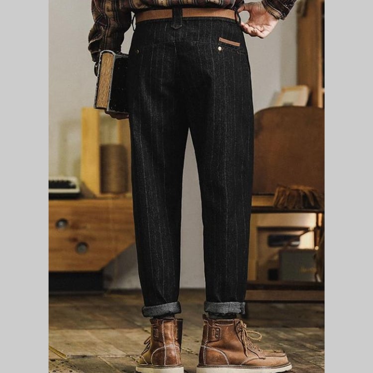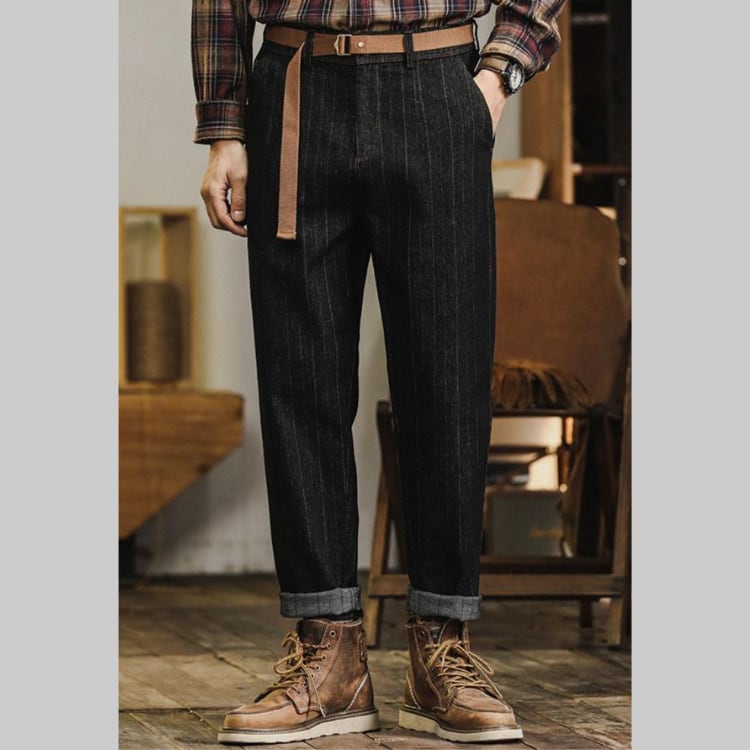ピンストライプのテーパードパンツ、登場です!アンクル丈のすっきりとしたシルエットが、どんなスタイルにも合わせやすく、着こなしの幅を広げてくれます。細めのピンストライプが上品さをプラスし、カジュアルながらも洗練された印象に。普段使いはもちろん、ちょっとしたお出かけにも最適です。ぜひ、あなたのワードローブに加えて、様々なコーディネートをお楽しみください。