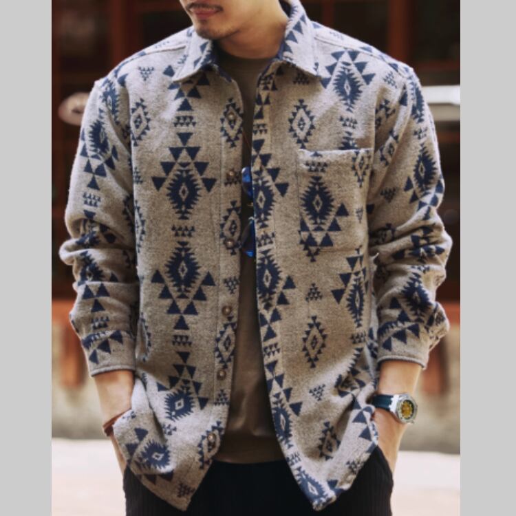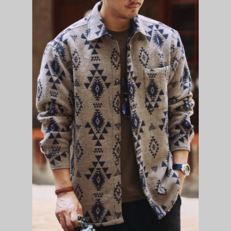 落ち着いた色合いの幾何学模様は、様々なスタイルに合わせやすく、着回し力抜群です。