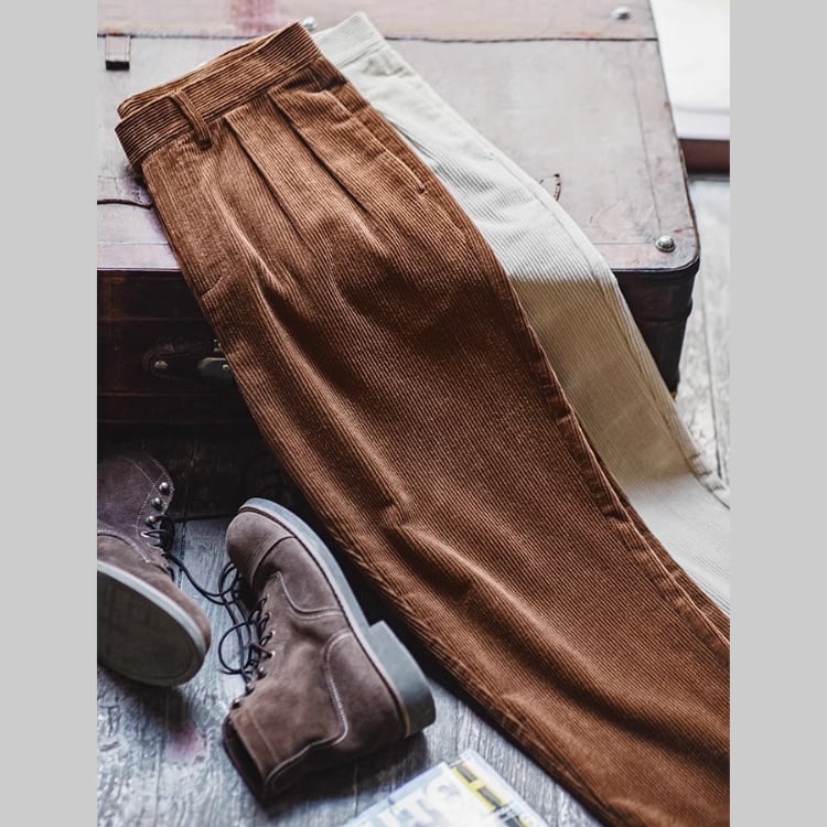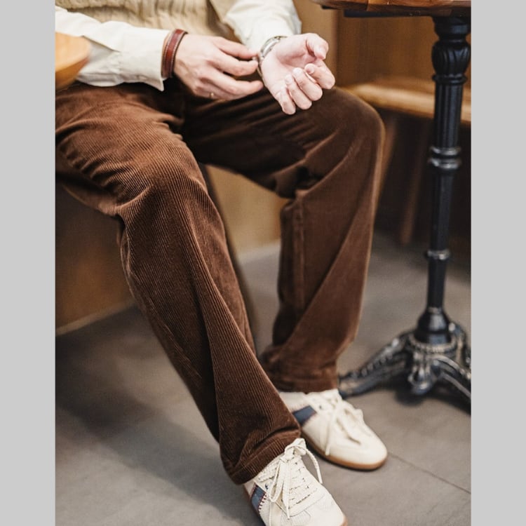 センタープレスとテーパードシルエットが洗練された印象を与えるコーデュロイパンツをご紹介!