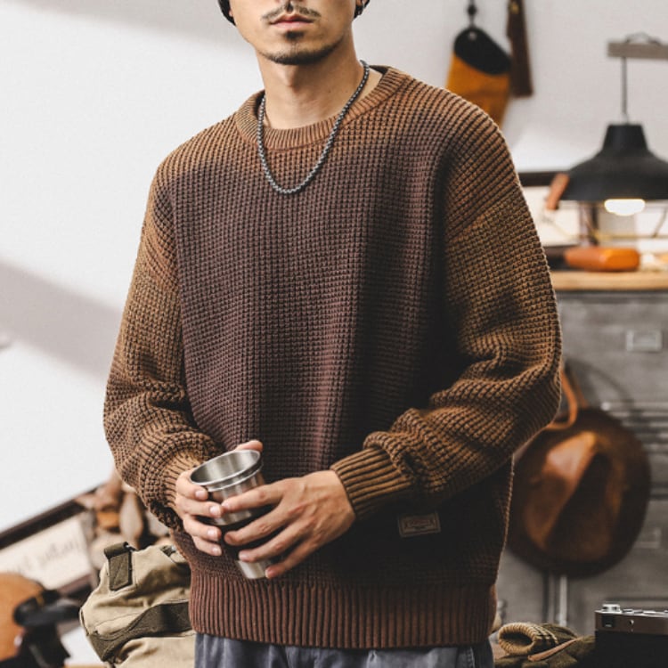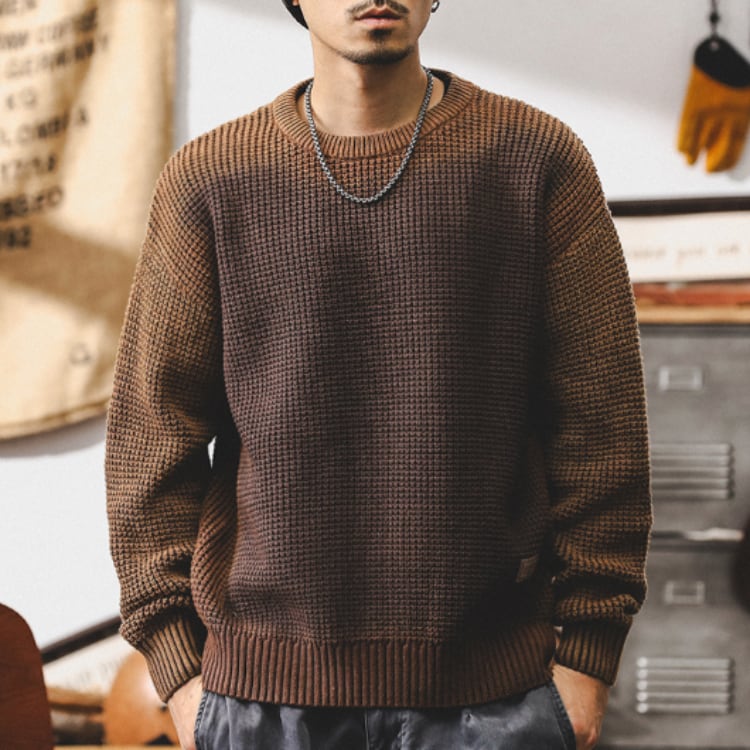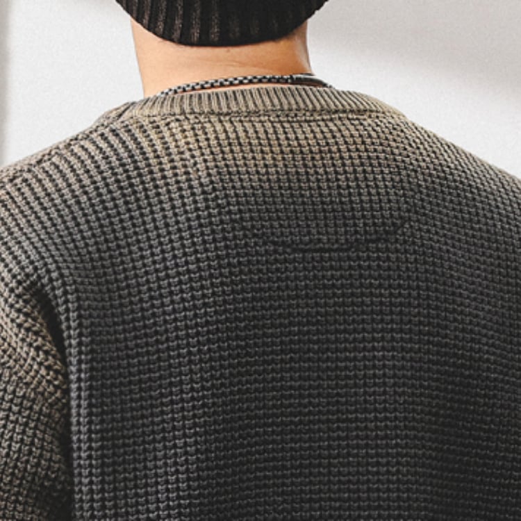 ニット帽はシンプルながらも存在感があり、クルーネックセーターは着心地抜群。