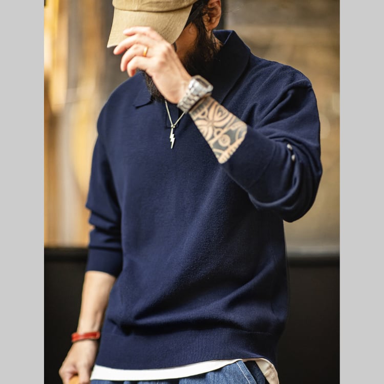 上品なラペルカラーとニット素材の組み合わせが、カジュアルながらも洗練された印象を与えます。
