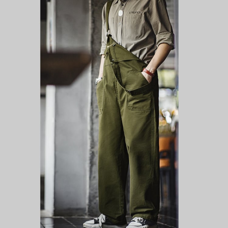 ワークウェアとしてのルーツを感じさせる、パッチポケットが特徴的なオーバーオール。