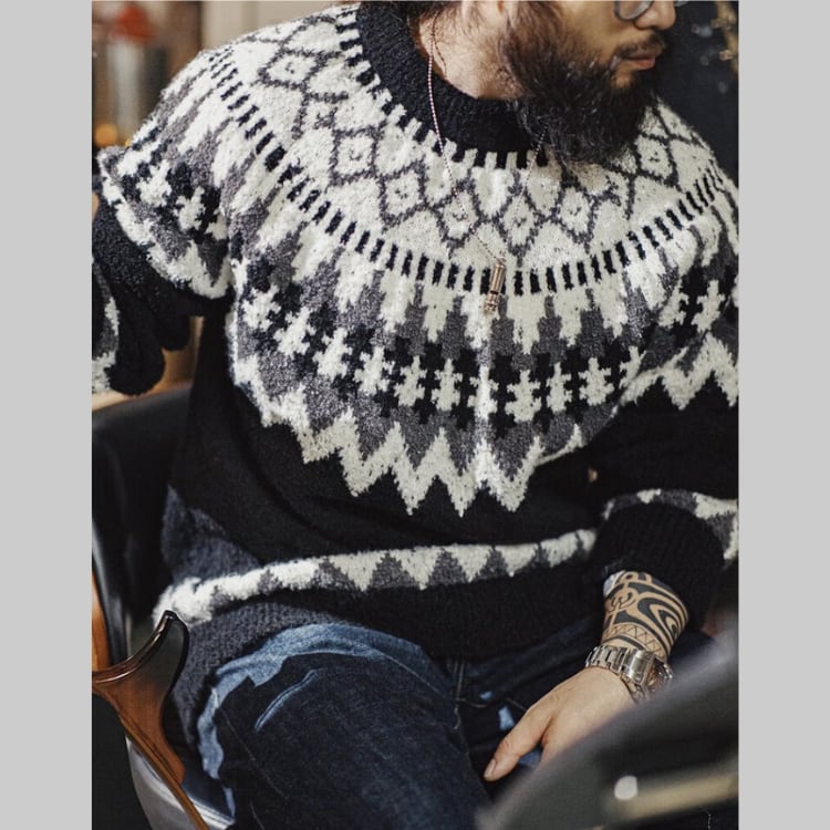 ノルディック柄が目を引くセーターは、コーディネートの主役になる一枚。