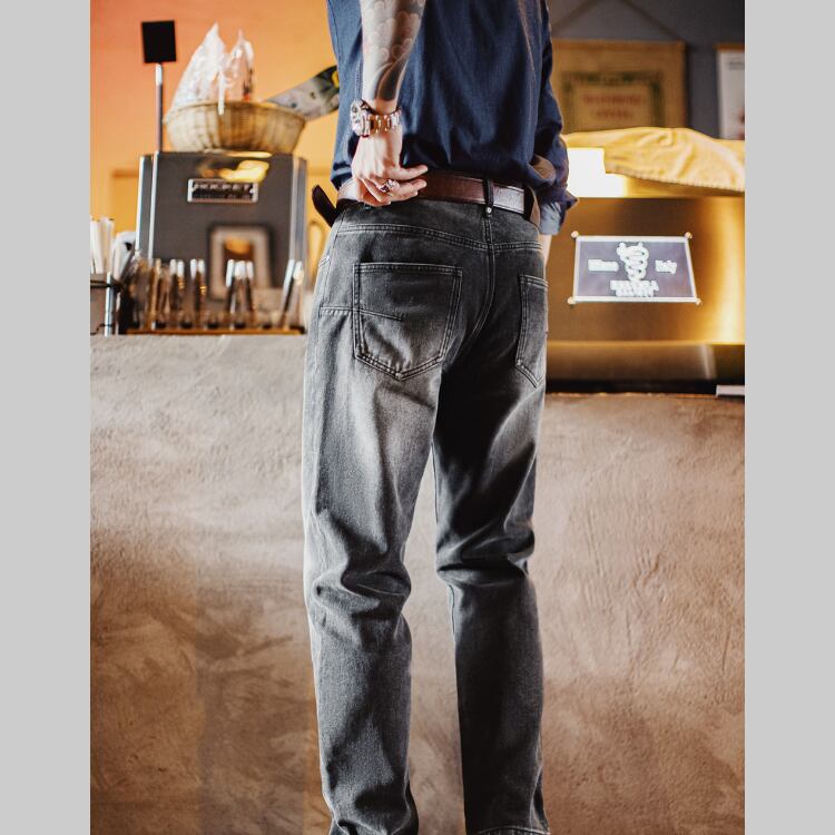 ストレートシルエットで、カジュアルながらも洗練された印象を与えるデニムパンツ。