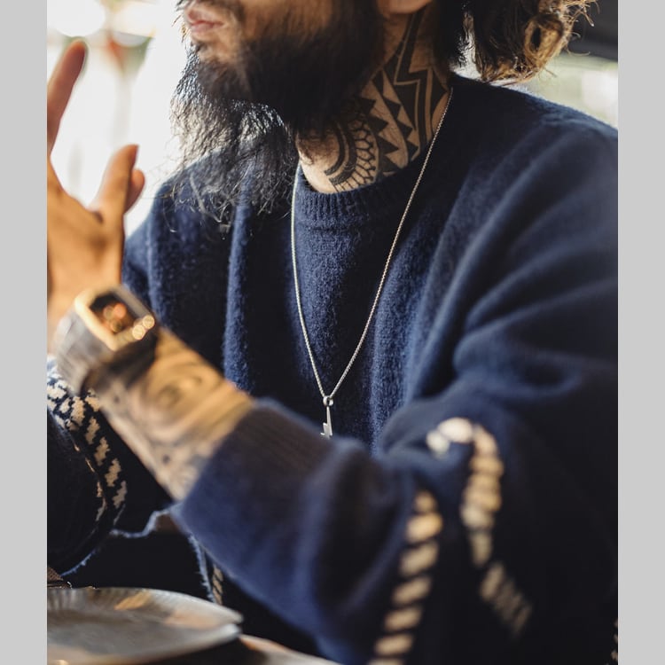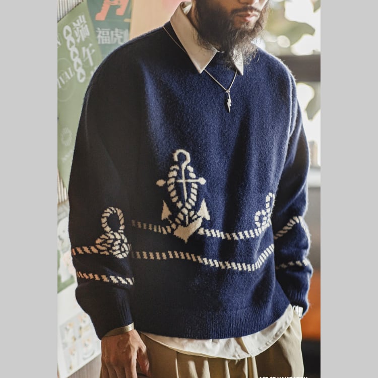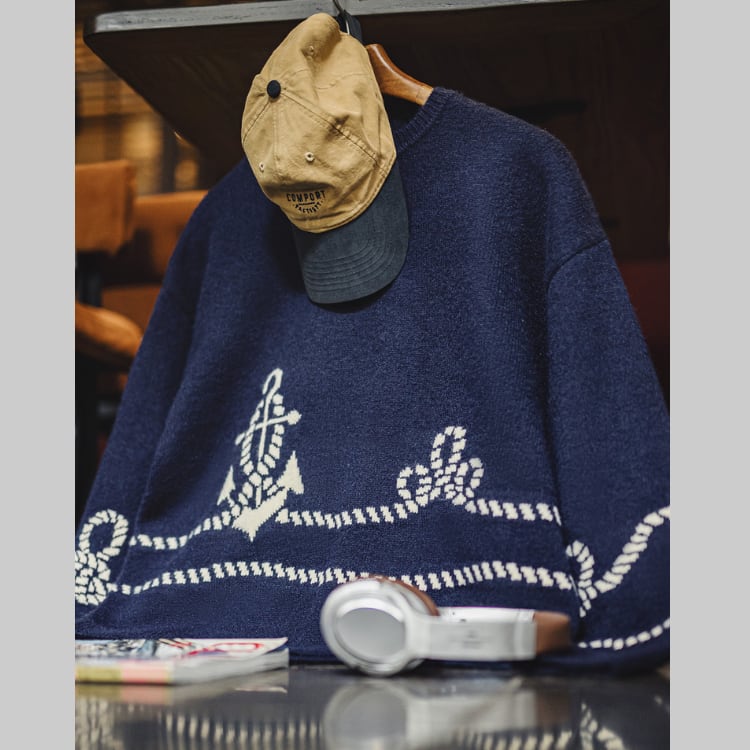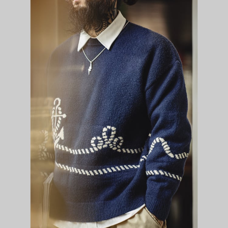 マリンスタイルを彷彿とさせる、イカリ柄ニット。